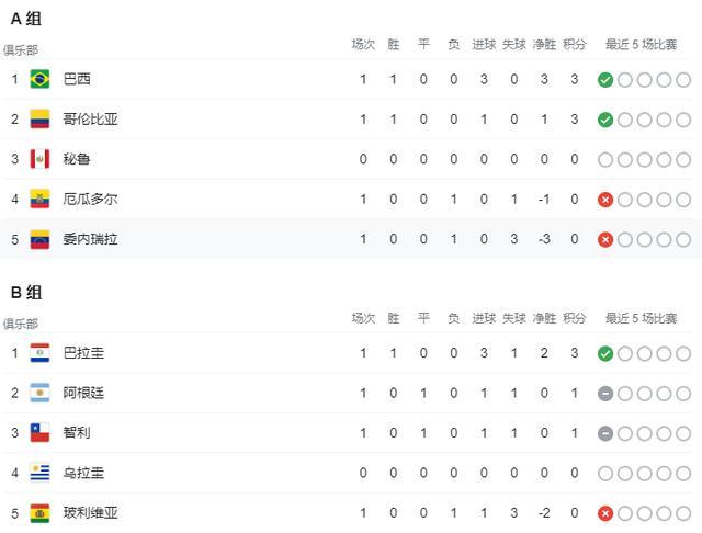 美洲杯积分榜:巴西A组头名,阿根廷B组第二
