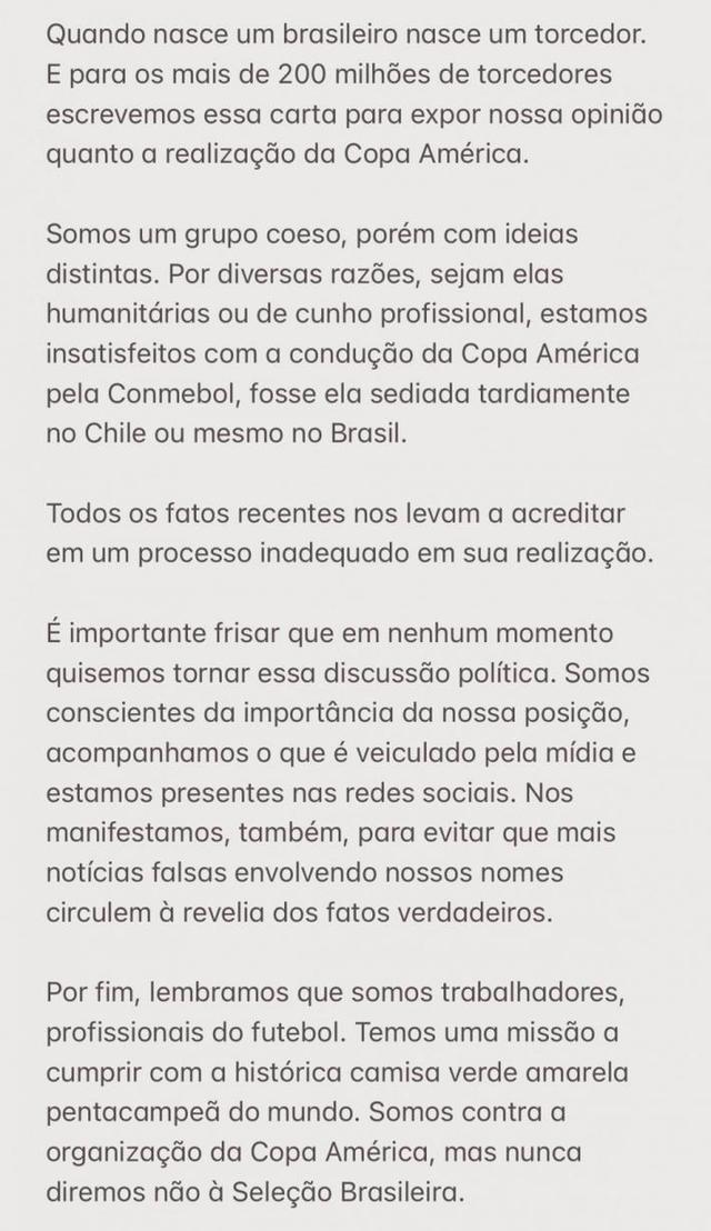 JRS直播网讯 今日,内马尔、阿利森、卡塞米罗等多名巴西球员发表公开信,表示反对本届美洲杯的赛事。