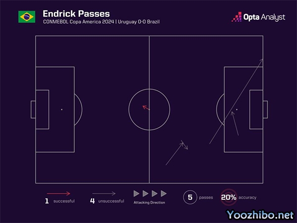 根据赛后数据统计,打满全场的他只有1次射门1次射正,3次尝试过人1次成功,地面对抗14次仅成功4次。此外,恩德里克全场24次触球,5次传球,传球成功率20%,唯一一脚成功传球是上半场中圈开球。他也是场上非门将触球次数最少(24次)&全场对抗失败次数最多(11次)球员。