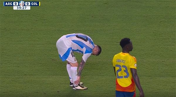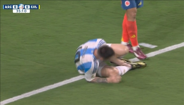 而受到对手恶劣侵犯后,梅西捂着脚痛苦不已。不过或许是为了阻止哥伦比亚利用阿根廷少打1人的机会,开门球继续进攻,梅西忍着剧痛连续翻滚3次回到场内,才继续躺着等待队医进场。