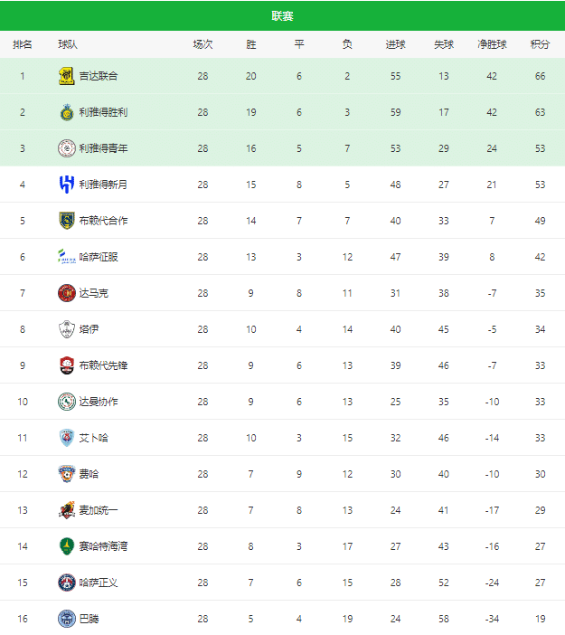 JRS直播网05月24日沙特联赛第28轮结束争夺,吉达联合1-0小胜巴腾,无限逼近联赛冠军。C罗率领利雅得胜利面对利雅得青年,上演让二追三的好戏,3-2掀翻对手,依旧有夺冠的希望。保级的争夺还是很激烈的,接下来我们一起来看看沙特联赛最新排名: