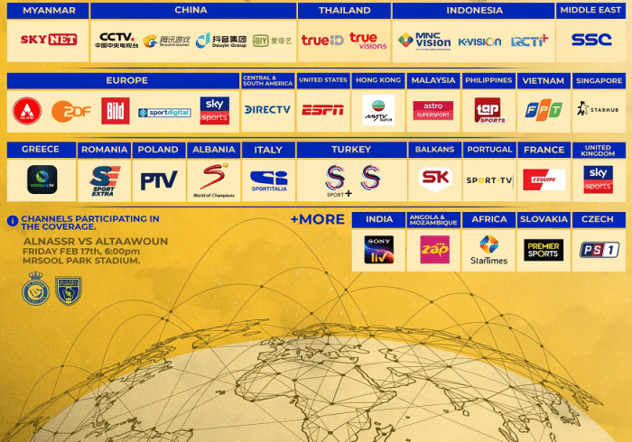 赛前沙特媒体制作出了这场比赛的全球主要国家时间表,中国的开赛时间是晚上23点。同时这场比赛有超过40个国家将直播沙特联赛,这在C罗加盟之前几乎是不敢想象的,沙特联赛更多的是中东和北非少部分国家在转播,如今C罗来了,影响力暴涨。