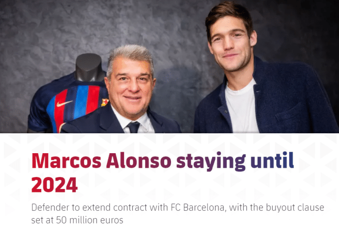 根据巴萨的官方消息,马科斯-阿隆索在续约之后的违约金将达到5000万欧元。