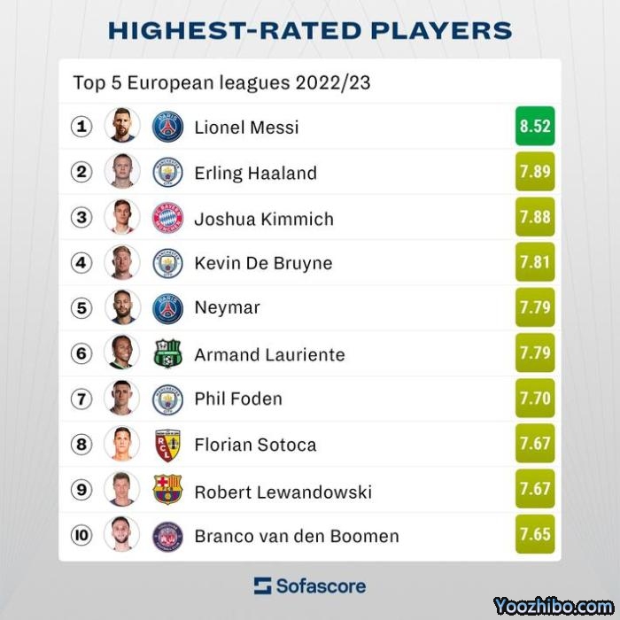 JRS直播网10月18日消息,数据网站Sofascore更新了2022-23赛季欧洲五大联赛球员评分排行榜,梅西以8.52分列第一,哈兰德第二。