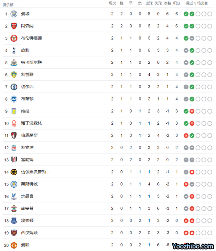 目前,曼城、阿森纳两连胜分别排名第一和第二,布伦特福德第三,热刺第四,切尔西1胜1平第七,利物浦2平第12,曼联2负倒数第一。