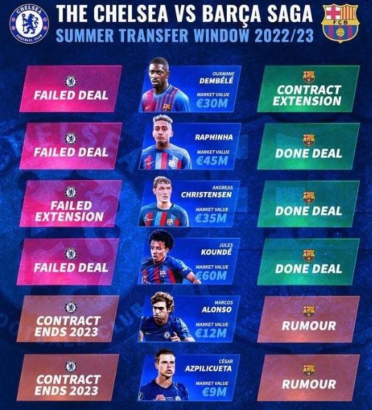 切尔西今夏被巴萨免费挖走了克里斯滕森,转会目标拉菲尼亚和孔德也加盟了巴萨,另一个目标登贝莱则和巴萨续约。
