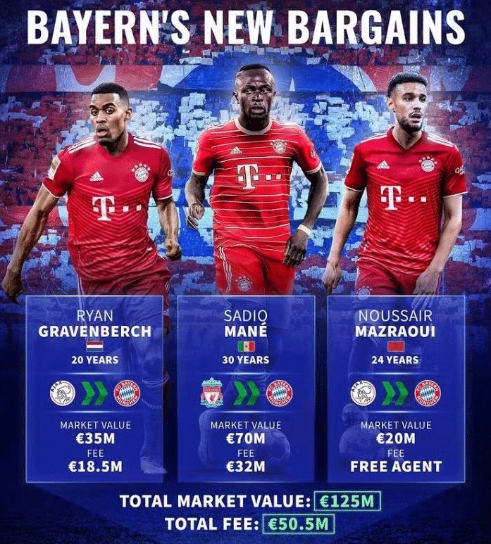 相比之下,拜仁的引援更为成功,他们以四折的价格签下价值高达1.25亿欧元的三大球星马内、赫拉芬贝赫、马兹拉维。拜仁签约“德转”身价高达7000万欧元的马内只花了3200万欧元转会费,签约身价高达3500万欧元的赫拉芬贝赫只花了约1900万欧元转会费,签约身价2000万欧元的马兹拉维一分钱转会费都没有花,属于自由转会。马内30岁,赫拉芬贝赫20岁,马兹拉维24岁,三笔签约足以让拜仁赚翻,俱乐部高层萨利哈米季奇因此获得了一片赞誉。