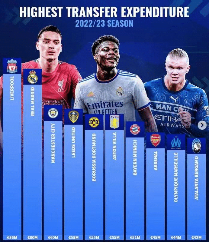 这些引援支出当中,利物浦和皇马的情况类似,以较高的转会费拿下了年轻球员,利物浦引进了努涅斯,他一人的固定转会费达到7500万欧元,加上浮动条款最终可涨到1亿欧元;皇马以8000万欧元拿下琼阿梅尼,加上浮动条款可涨至1亿欧元。两大俱乐部豪气十足。