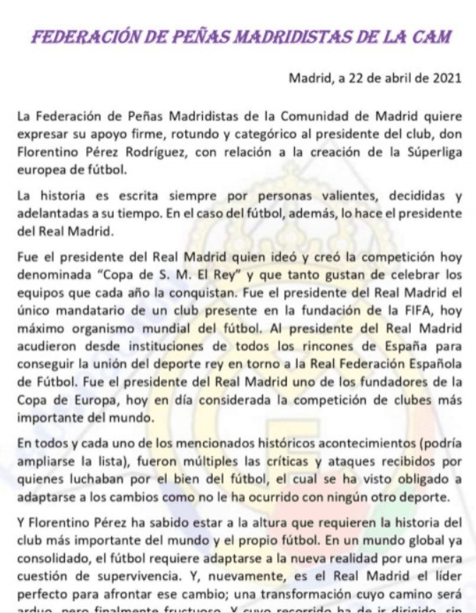 皇马马德里自治区球迷协会今天发表了声明:“针对欧超成立这个事,我们会坚定的支持佛罗伦迪诺先生的决定,历史都是由勇敢的人来书写的,他们总是走在时代的前列。在足球界,这个壮举会由皇马来完成。在欧超创建过程中,肯定会遭到许多人的批评和质疑,但是他们要看到足球变革的必要性。足球需要新的环境,而皇马就是推动这次变革的领导者。”