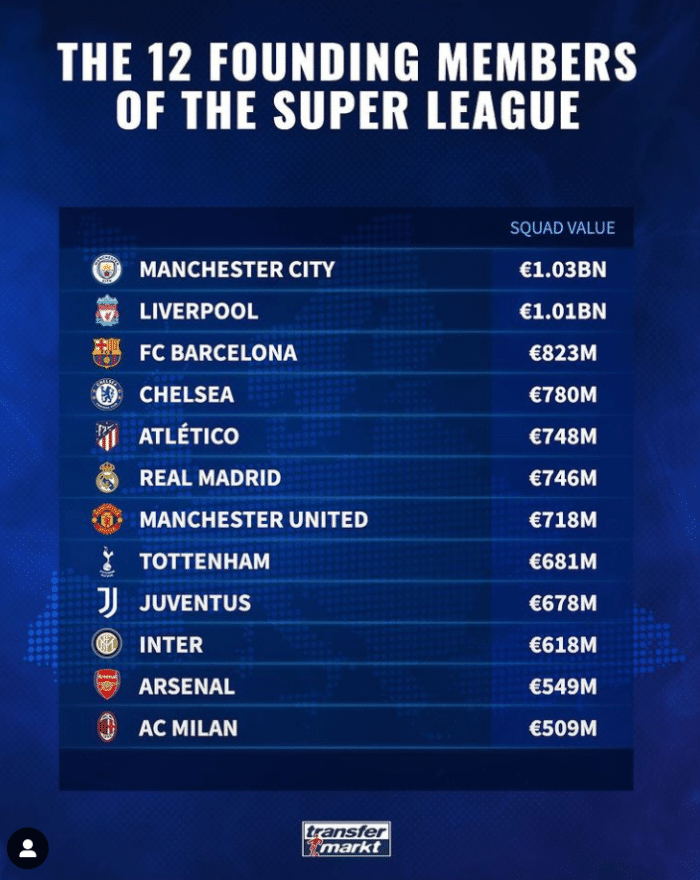 欧洲超级联赛十二队阵容身价如下: