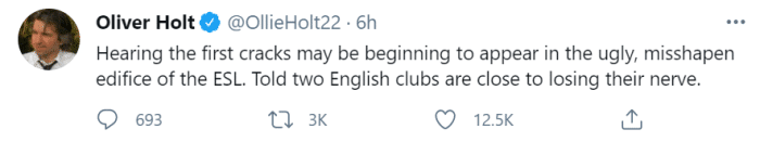霍尔特写道:“听说在欧洲超级联赛这座畸形、丑陋的大厦中,第一道裂痕可能已经开始出现。我被告知有两支英格兰俱乐部已经快要失去坚持下去的勇气了。”