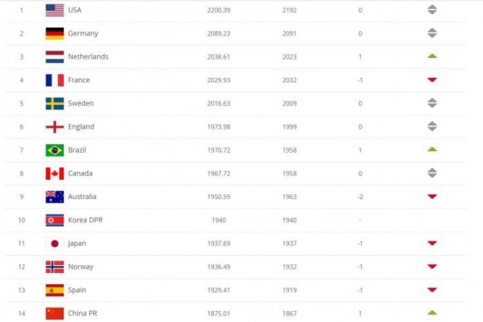 女足世界排名: