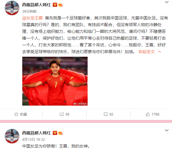 就在4月15日晚上,韩红再度发文力挺王霜,她表示:“首先我是一个足球爱好者,其次我挺中国足球,尤爱中国女足。没有球星真的行吗?是的,我们有团队,有技战术配合,但没有领军人物的冷静处理,没有场上组织能力,核心能力和临门一脚的大将风范,请问行吗?不随便恶捧一个人,保护好他们,让他们用平常心去对待自己热爱的足球,不要轻易打击一个人,打击大家的积极性……看了某个采访,心会冷……我挺你,王霜,好好去享受足球带给你的快乐,球迷们愿意与你们荣辱与共!加油。”