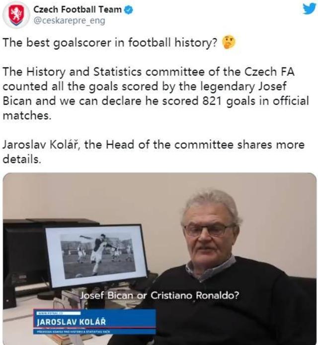 JRS直播网1月22日讯 捷克足协最近在他们的官方推特上发文表示约瑟夫-比坎的正式比赛进球数为821个,这意味着C罗还差62球才能超过这位捷克传奇球星,成为历史上正式比赛进球最多的球员。