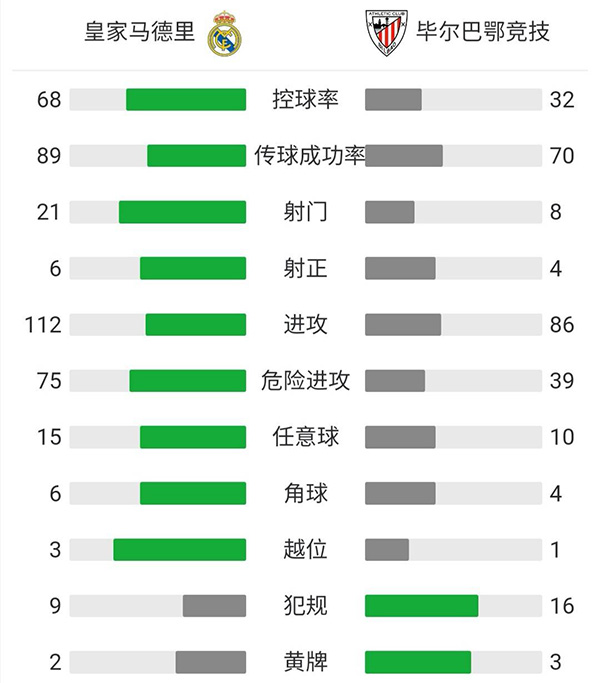 查看:皇家马德里vs毕尔巴鄂 全场录像技术统计: