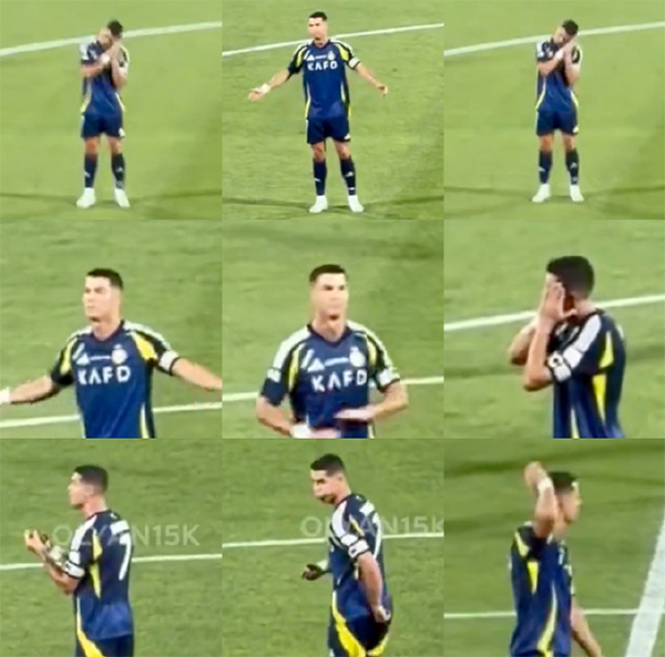 比赛第69分钟时,米当特罗维奇将场上比分改写成3-1,新月领先2球。这粒进球后,C罗彻底怒了。他被镜头捕捉到向队友连续做手势,表达自己的不满。C罗两次将双手放在脸的一侧,似乎在暗示队友们已经“睡着了”。