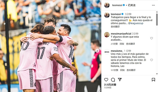 而赛后,梅西也第一时间在社交媒体上发文庆祝,他晒出了自己与队友拥抱在一起的照片,并且开心表示:“我们努力进入决赛,球队做到了!我们还有最后一小步!”短短5分钟内,这条动态已经有接近32万人点赞。
