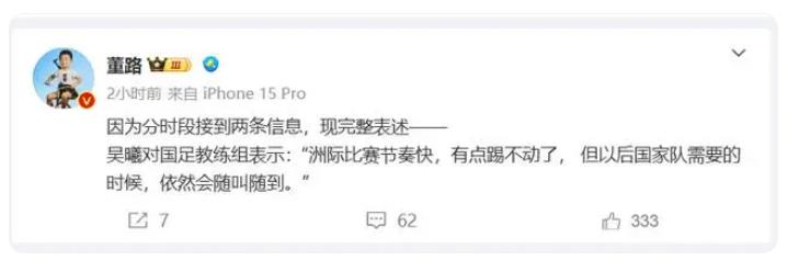 事实上,从内线来说,吴曦并不是不想承担责任,在摊牌后,吴曦也是官宣了决定,那就是“以后国家队需要的时候,依旧会随叫随到。”这也印证了董路的话语,吴曦不是不想为国出征,而是他明白这样的选择才是对于中国足球最好的帮助,毕竟他已经35岁了,竞技体育终究年轻人的天下。