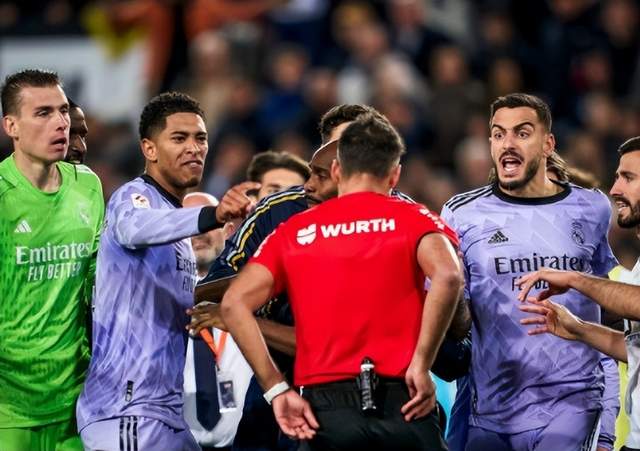 从慢镜头来看,主裁一直盯着皮球运行的过程,而皇马此时并未丢失球权,还处于进攻中,并且已经完成了传中。主裁判此时吹响终场哨,实在令人感到不可思议。更何况,补时阶段VAR曾经介入,主裁判理应把这部分时间计算进去。可以说,皇马这场比赛遭遇了千古奇冤。而赛后,贝林厄姆等皇马球员围住主裁,讨要说法。贝林厄姆说道:“球还在空中,这到底TM是什么玩意。”结果,贝林厄姆被红牌罚下。其余皇马球员也怒不可遏,还好被工作人员劝离。