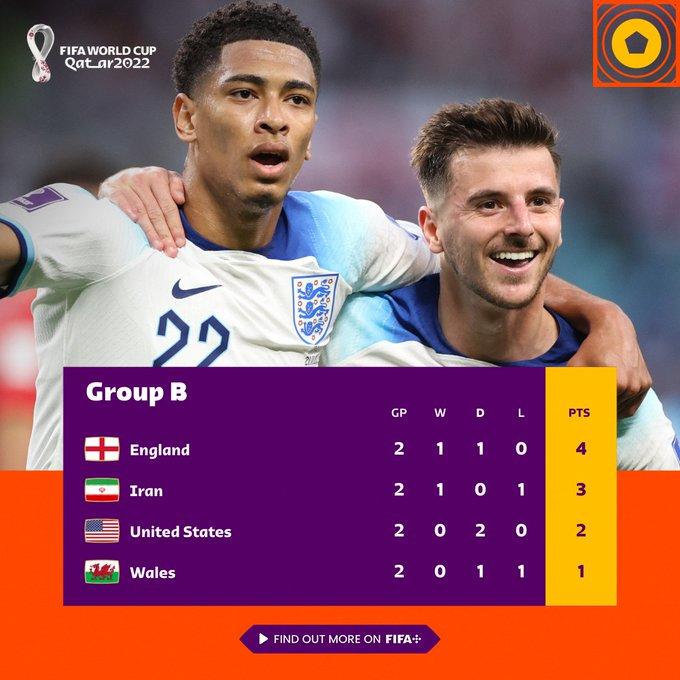 B组方面,英格兰闷平美国后4分4净胜球排名第一,伊朗3分-2净胜球第二,美国2分0净胜球第三,威尔士1分-2净胜球第四,悬念留到了最后一轮。
