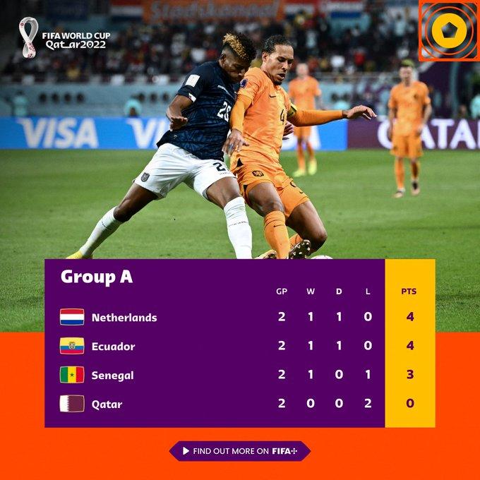 荷兰1-1平厄瓜多尔后,两队均积4分并有2个净胜球,排名A组前二,塞内加尔在击败卡塔尔后3分排名第三,卡塔尔则0分-4净胜球垫底出局。