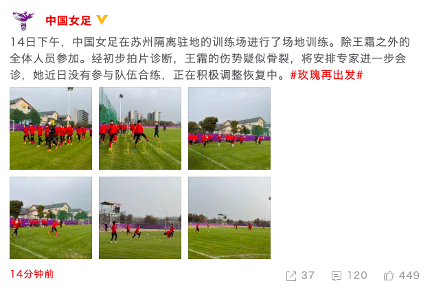 JRS直播网02月15日讯 ,中国女足官方发布消息,球队的核心王霜经初步拍片诊断,伤情为疑似骨裂,国家队将安排专家进一步会诊。目前,在苏州酒店隔离的中国女足全队已经重返隔离驻地的训练场进行训练,但王霜并没有参加,她正在积极调整恢复中。