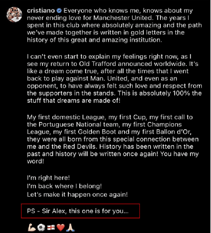 C罗发文的内容大致意思是:【每个人都知道我对曼联的爱。我在这家俱乐部度过了很长时间,这家俱乐部有着辉煌的历史。我现在甚至无法解释我的感受,因为我看到了世界各地宣布我回归曼联的消息。这就像梦想成真一样,即便作为对手,我也能够感到曼联对我的爱和尊重。我的第一个国内国内联赛,第一个国内杯赛,第一个欧冠冠军,第一个金靴和金球奖都是在这里诞生的。他们让我和曼联有着特殊的联系。历史将会被再度书写,我保证。我就在这里,我回到了属于我的地方。弗格森决赛,这一切都是因为你。】