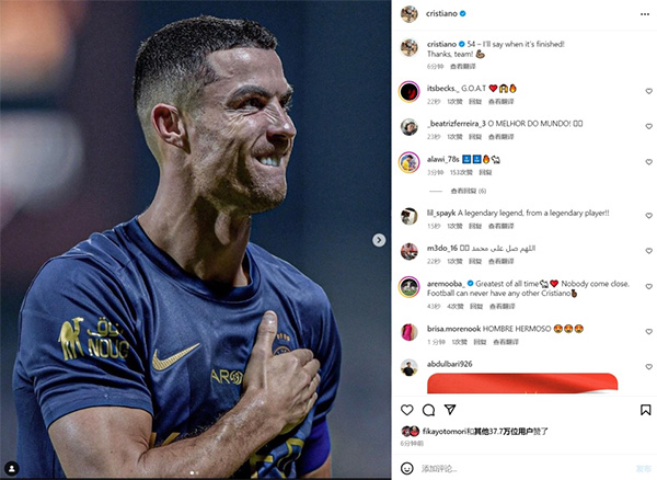而赛后,葡萄牙巨星C罗也第一时间更新了社交媒体。C罗晒出了自己进球后拍胸前利雅得胜利队徽的帅气照片。并且附文写道:“54!当我说结束那才是结束(I WILL SAY WHEN IT'S FINISHED),再次感谢团队!”