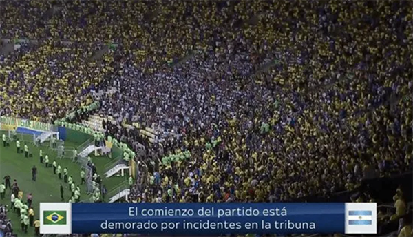 比赛开始之前,可以看出,现场的阿根廷队球迷方阵被安保人员和志愿者被围了起来,这样就可以与同看台的巴西球迷分隔开。比赛继续进行,不过双方的球员们火气都很大,黄牌满天飞,各种犯规、倒地和教练不满。