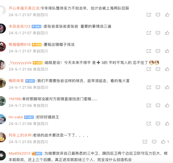 成都球迷写道:“丑陋的平局!徐正源应该好好反省了!”;“换教练吧,徐正源的水平已经到了天花板了,被对手研究透了,再打下去就是个中游水平!”:“为啥要放弃自己最熟悉的三中卫,踢四后卫两个边后卫防守压力巨大,还上三个后腰。真正进攻就前场三个人,完全没什么创造机会!”