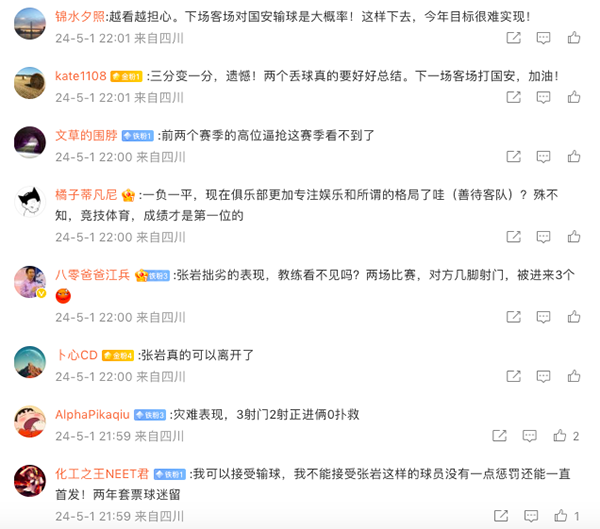 此外,还有不少人对于首发门将张岩的表现相当不满:“张岩真的可以离开了,灾难表现,对手3次射门2次射正进2球!”:“我可以接受输球,我不能接受张岩这样的球员没有一点惩罚还能一直首发!”:“好一个摄政王,今夏赶紧送出去吧。”:“某些人真的已经不是水平问题了,而是灾星般存在。”:“张岩冒充职业守门员。”;“蹇韬究竟何时能够复出,真的不想再看到张岩了。”