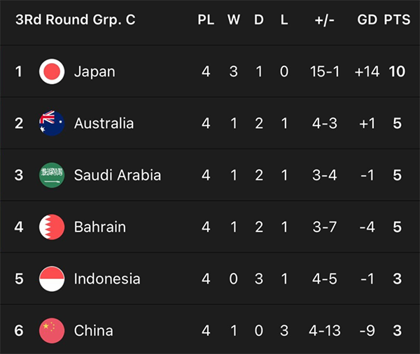 本轮过后,C组的出线形势也变得扑朔迷离。尽管连胜被终结,但日本在本组依然一骑绝尘领跑,4轮后3胜1平积10分。两支传统强队澳大利亚和沙特阿拉伯,还有西亚劲旅巴林队同积5分,按照净胜球的区别,分别排名第2至第4位。