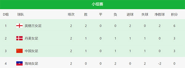 中国女足负于英格兰:丹麦女足负于海地,中丹海三队同积3分,需比较净胜球和胜负关系。如果丹麦女足平或胜,中国队出局;