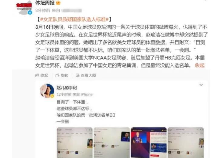 名记马德兴的喊话并没有让球迷能够理性的对待女足在世界杯的惨败,反而炮轰和内涵水庆霞的群体不仅仅是球迷,连女足的球员也增加了,在女足惨败后,入选大名单的唐佳丽和肖裕仪也是内涵了水庆霞,而近期,没有能够入选女足大名单的赵瑜洁、张馨、李影等女足球员也是站了出来喊话,特别是赵瑜洁这边,赵瑜洁当时是因为体重不达标被淘汰的,在社交媒体上,赵瑜洁晒出了几支其他女足球队核心的体重表示:目测了一下体重,这些球员都不达标,咱们国家队第一批淘汰名单。