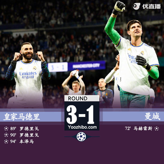 JRS直播网讯5月5日讯 北京时间5月5日凌晨3:00,2021-22赛季欧冠半决赛次回合,皇马主场迎战曼城,上半场两队均有几次威胁攻势,但没能取得进球,半场皇马0-0曼城;下半场马赫雷斯破门,罗德里戈常规时间最后时刻扳平比分,随后补射阶段再次破门,皇马2-1曼城,总比分5-5,比赛进入加时;加时赛上半场,本泽马被鲁本-迪亚斯铲倒,皇马得到点球,本泽马主罚命中,加时赛下半场两队均无建树,最终皇马加时3-1击败曼城,总比分6-5淘汰对手进入决赛。