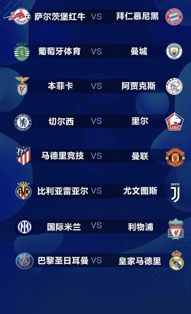 欧冠1/8决赛抽签结果新鲜出炉(前者先主后客):