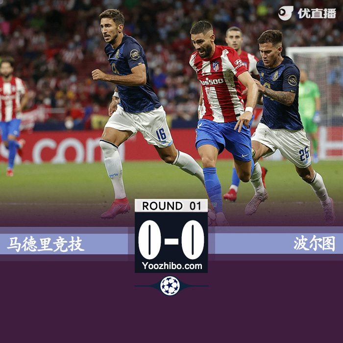 JRS直播网9月16日讯 北京时间9月16日凌晨3点整,2021-22赛季欧冠B组首轮在万达大都会球场展开角逐,马德里竞技坐镇主场迎战波尔图。上半场苏亚雷斯造威胁,下半场奥塔维奥中柱,塔雷米进球被吹,姆本巴终场前染红,最终马德里竞技主场0-0战平波尔图。B组积分榜方面,马竞与波尔图同积1分,分列二、三名。