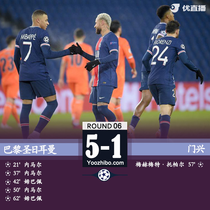 JRS直播网讯:北京时间12月10日凌晨1:55,2020-2021赛季欧冠小组赛H组第6轮,巴黎圣日耳曼与伊斯坦布尔的比赛恢复进行。上半时比赛内马尔梅开二度后造点,姆巴佩点射一蹴而就扩大优势。下半时比赛内马尔世界波破门成功戴帽,托帕尔为客队追回一球,迪马利亚随后助攻姆巴佩再下一城锦上添花。最终,巴黎圣日耳曼5-1击败伊斯坦布尔头名出线。