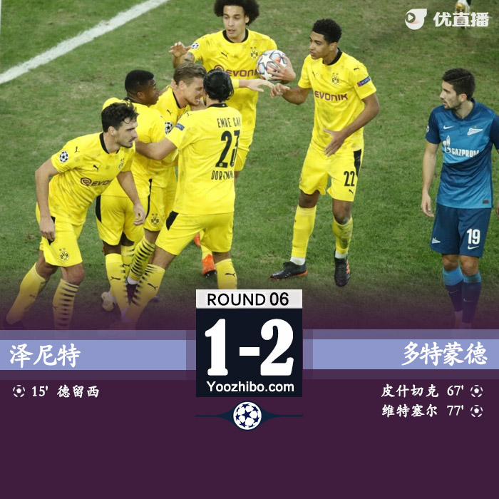 JRS直播网讯:北京时间12月9日01:55,欧冠小组赛F组第6轮泽尼特对阵多特蒙德。上半场比赛,德里尤西破门,阿兹蒙进球被吹越位,泽尼特半场1-0领先多特。下半场比赛,皮什切克、维特塞尔先后破门。最终,多特蒙德客场2-1逆转圣彼得堡泽尼特,6场小组赛4胜1平1负,以F组小组榜首身份出线。