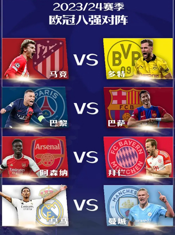 JRS直播网讯 北京时间3月15日,2023-24赛季欧洲冠军联赛1/4决赛抽签结果正式出炉,本次抽签规则无种子队,无同联赛回避。最终卫冕冠军曼城遭遇皇马,阿森纳PK拜仁。