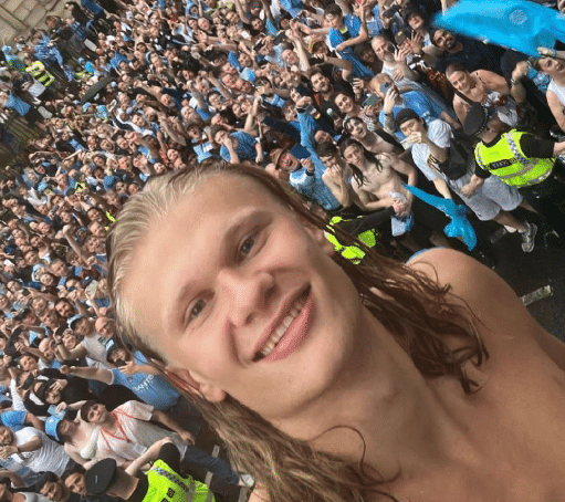 哈兰德可以说放飞自我,除了在游行期间光着膀子,录制视频的时候朝着格拉利什头上倒香槟,还做出了鬼脸和大笑的样子。到了仪式期间,哈兰德手中拿着欧冠大耳朵杯,摇摇晃晃,非常开心。