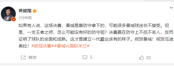 赛后著名足球人黄健翔点出了曼城赢球的关键,那就是防守,他直言:“如果有人说,这场决赛,曼城是靠防守拿下的,可能很多曼城球迷会不接受。但是,一支王者之师,怎么可能没有好的防守呢?决赛赢在防守上不但不丢人,反而证明了球队的全面和成熟。这才是建立一代霸业该有的样子。祝贺曼城!祝贺瓜迪奥拉!”