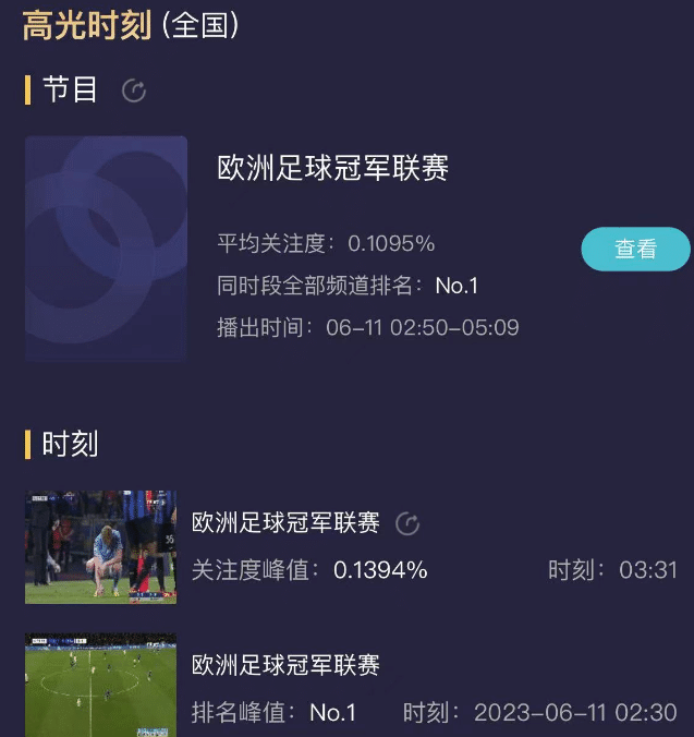 这场比赛的关注度很高,根据赛后的数据显示,曼城1-0击败国际米兰的比赛收视率位居同时间段第一,在深夜时分点燃了球迷们的激情。比赛的过程并不是精彩的对攻大战,但也很紧张激烈,曼城首度加冕三冠王。