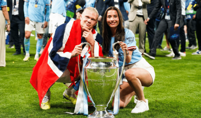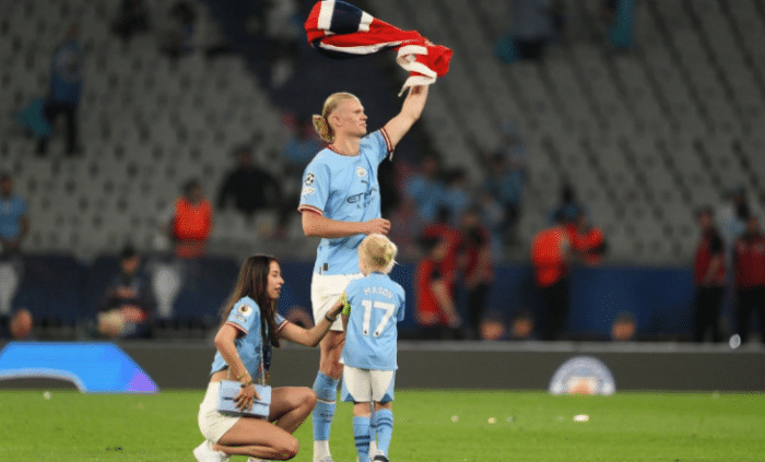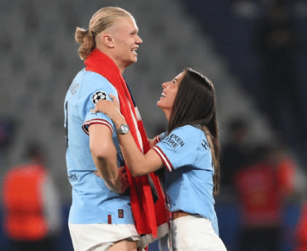 哈兰德与爱人伊莎贝尔一起庆祝,他们拿下大耳朵杯庆祝冠军,之后亲吻的环节,哈兰德与女友还被国旗挡着,有点娇羞的感觉。值得一提的是在哈兰德与爱人庆祝的时候,一旁有一个孩子,那并不是哈兰德的小孩,而是德布劳内的儿子误入画面中。哈兰德来到曼城的第一年就达到荣誉上的巅峰,斩获三冠王的同时个人加冕英超金靴奖,打破纪录。