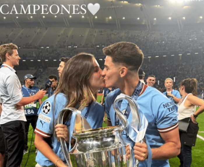 阿尔瓦雷斯女友艾米利亚也在个人社媒晒出与阿尔瓦雷斯甜蜜亲吻照,两人共同捧起冠军奖杯。两人在场内拿着欧冠冠军奖杯,亲吻起来,阿尔瓦雷斯虽然并非曼城的绝对主力,但也在夺冠的过程中起到关键作用,本赛季他加冕世界杯和欧冠冠军,历史第12人。
