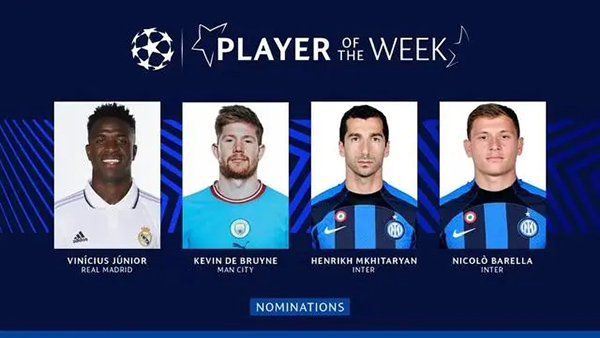 JRS直播网05月11日讯 北京时间今日,欧冠半决赛首回合的比赛已经全部结束,皇马1-1战平曼城,米兰0-2不敌国米。而欧足联官方也在今日列出了本轮欧冠周最佳球员的候选4人名单: