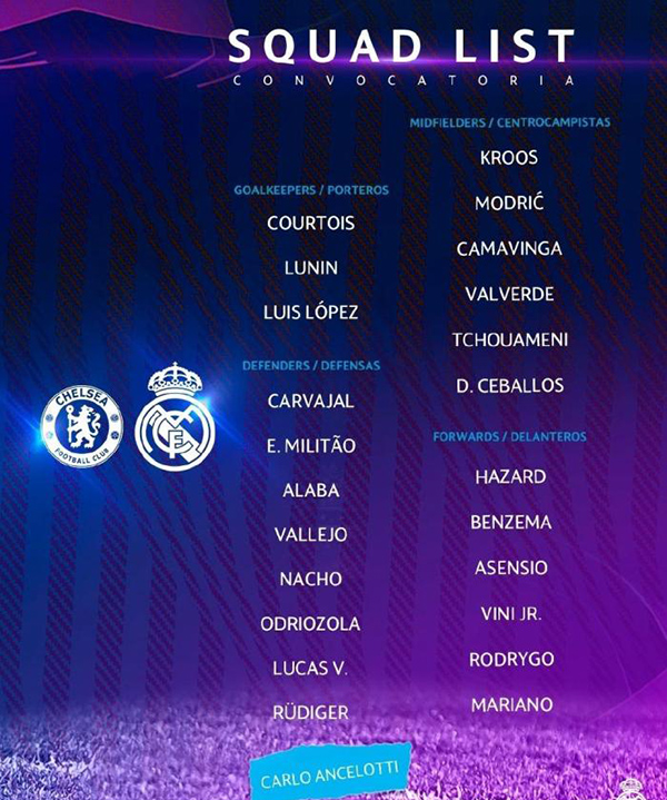 后卫:卡瓦哈尔,米利唐,阿拉巴,巴列霍,纳乔,奥德里奥索拉,巴斯克斯,吕迪格