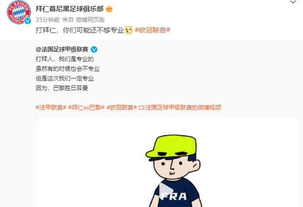 比赛结束之后拜仁晋级,大巴黎被淘汰,拜仁官方回应道:“打拜仁,你们可能还不够专业”