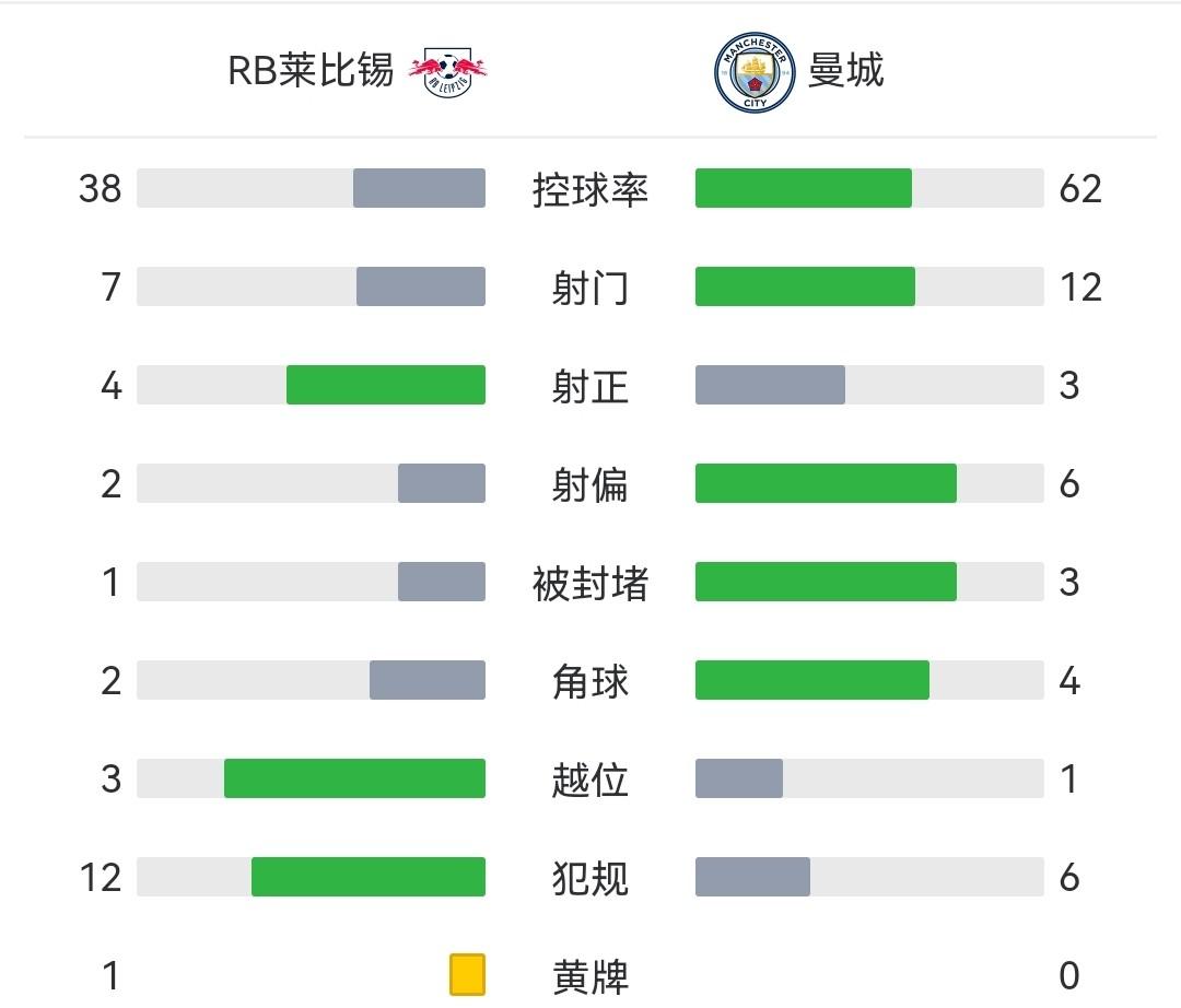 全场比赛结束,最终曼城客场1-1战平莱比锡。