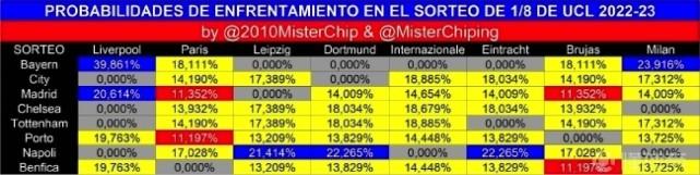 至于梅西、姆巴佩、内马尔所在的大巴黎,因为同样屈居第2,淘汰赛首轮,他们碰到拜仁的概率超过18%。而多特蒙德则22%的概率会与那不勒斯交手。